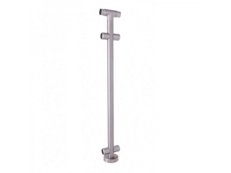 Der Pfosten hat eine angeschweißte Grundplatte und beinhaltet zudem eine Abdeckrosette, sowie die Aufnahmen für die geschweißten Geländerelemente.